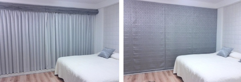 最終的には生地サンプルを現地に持参してお部屋に合せさせて頂きました。光沢感のあるドレープ(プレーンシェード)無地で柔らかいレース2 倍ヒダ裾ウエイトテープ仕上げ。