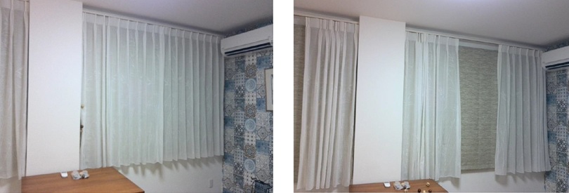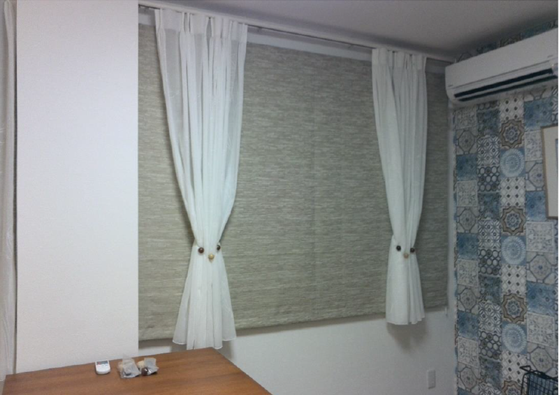 お客様の遊び心で、手前にレースカーテン、後ろにプレーンシェードを付けました。マンションなのですが、プレーンシェードを開けると中廊下になっています。